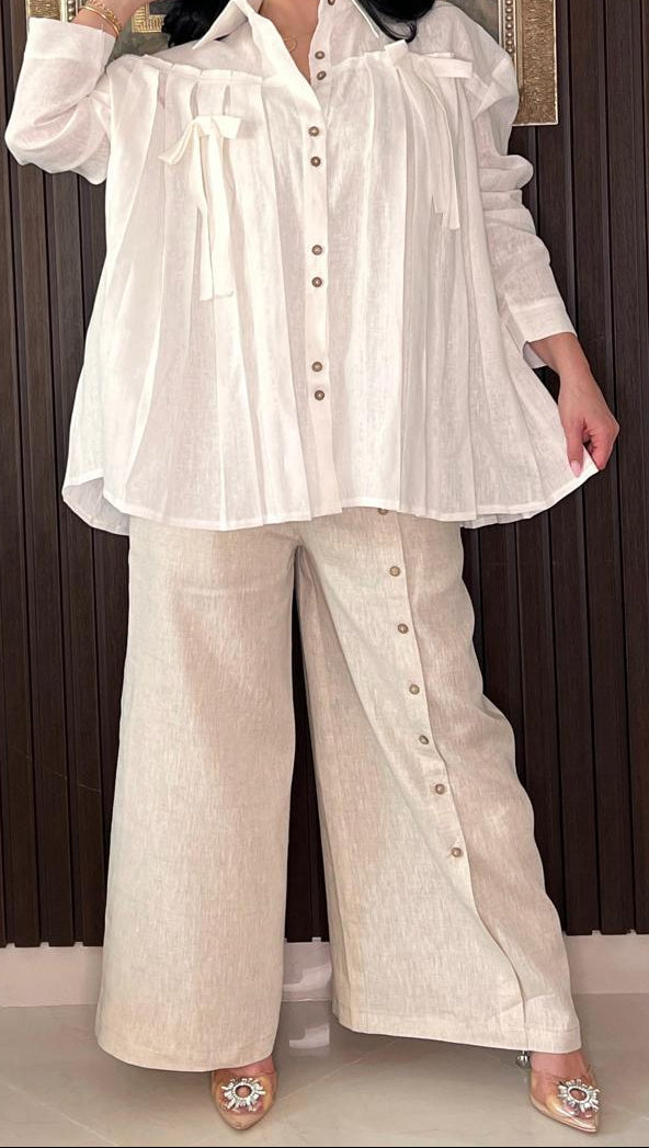 بدلة قميص لينن مضلع مع بنطلون ازرار